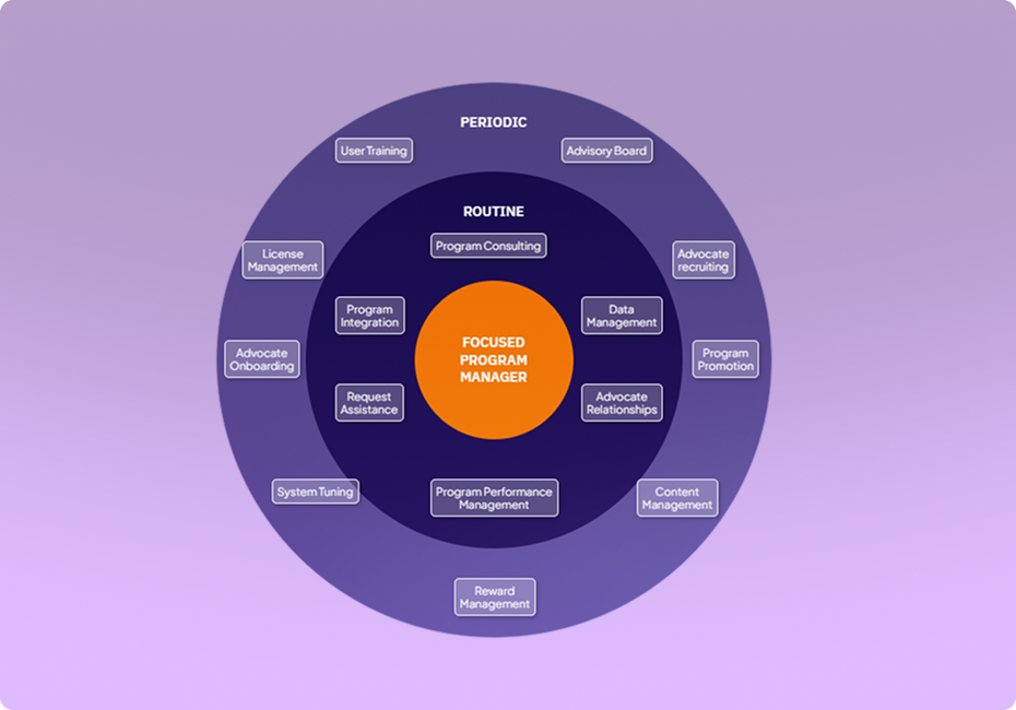 Leads a customer advocacy program by aligning strategy with company goals, managing data and relationships, supporting requests, tracking performance, and integrating advocacy across teams—featuring an interactive graphic to enhance the experience.